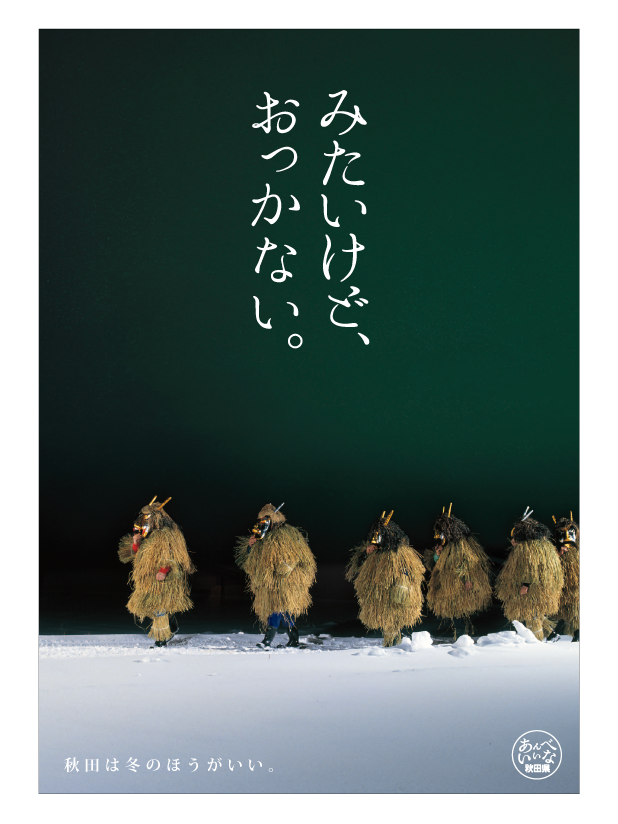 Any bad kids? 怖いはずのナマハゲがなんともチャーミングで印象的なポスターです。10年前、秋田美人の写真に添えた「あきたびじょん」のポスターも、小さな「よ」が世界観を大きく変えた傑作でした。