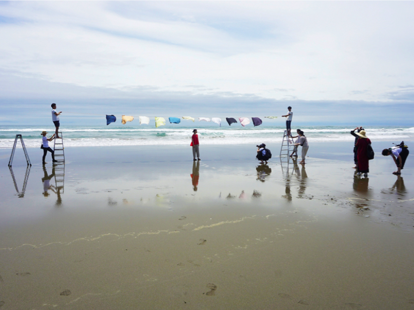 砂浜に間伐材を立て、ロープを引っ張って全国から募ったTシャツを展示する。最後は返却する。1週間は太陽と月の光で鑑賞する。